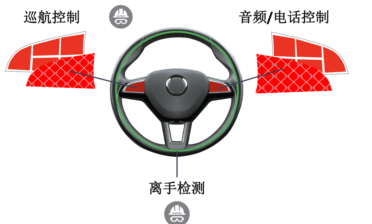 Microchip电容感应式HOD方案运用先进的电容感应技术,通过在方向盘内部嵌入电容感应层,实现了类似电容触摸按键的功能。MCU对感应信号进行精确检测后,通过总线将数据传输至车辆其他ECU。这种方案实现了对整个方向盘区域的全方位感应配置,用以精准监测驾驶员的手部位置和动作,进而实现驾驶员脱手检测功能。