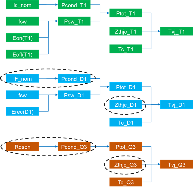 由图11,无论快管还是慢管,都存在50Hz的结温Tvj波动。结合前面的仿真分析可知,快管位置T1/D1的损耗及结温Tvj波动的影响因素,和慢管位置Q3的情况是不同的,如图12所示: