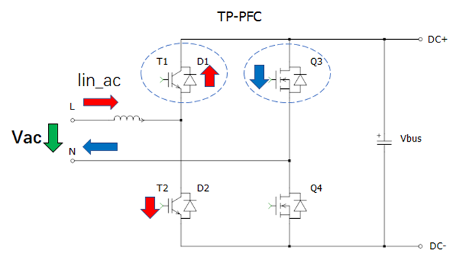 在单相图腾柱PFC的慢管位置:有单向充电的二极管,也有V2X双向需求的IGBT单管或者Si MOSFET单管方案。